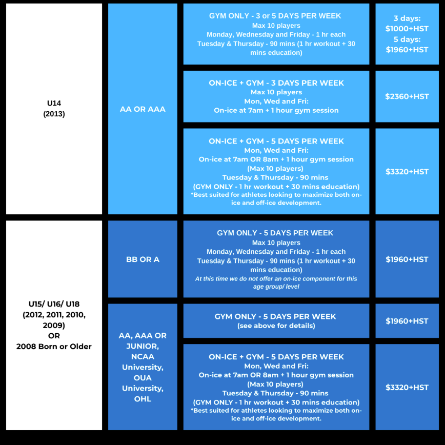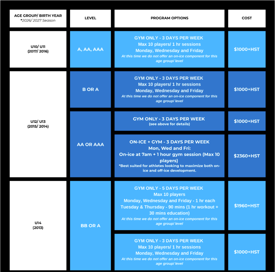Strength & Conditioning That Translates On Ice We build the physical qualities that directly impact your game: explosive power, first-step quickness, speed and agility, and the conditioning to perform every shift.