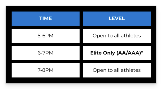 Elite Group (AA-AAA+): 6:00pm – 7:00pm